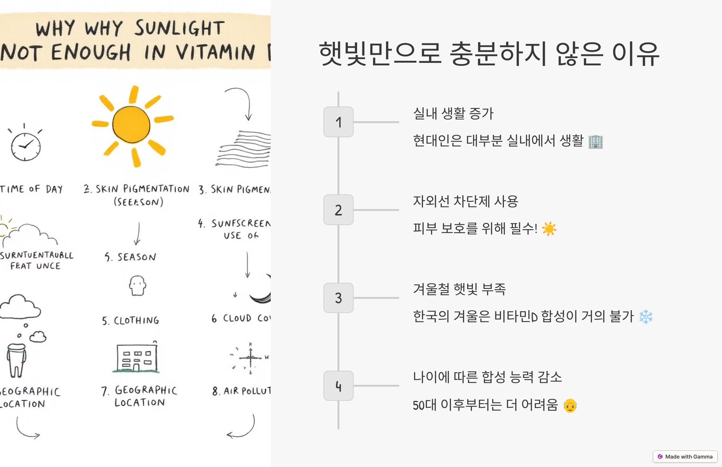 햇빛을 통한 비타민D 합성이 어렵습니다.