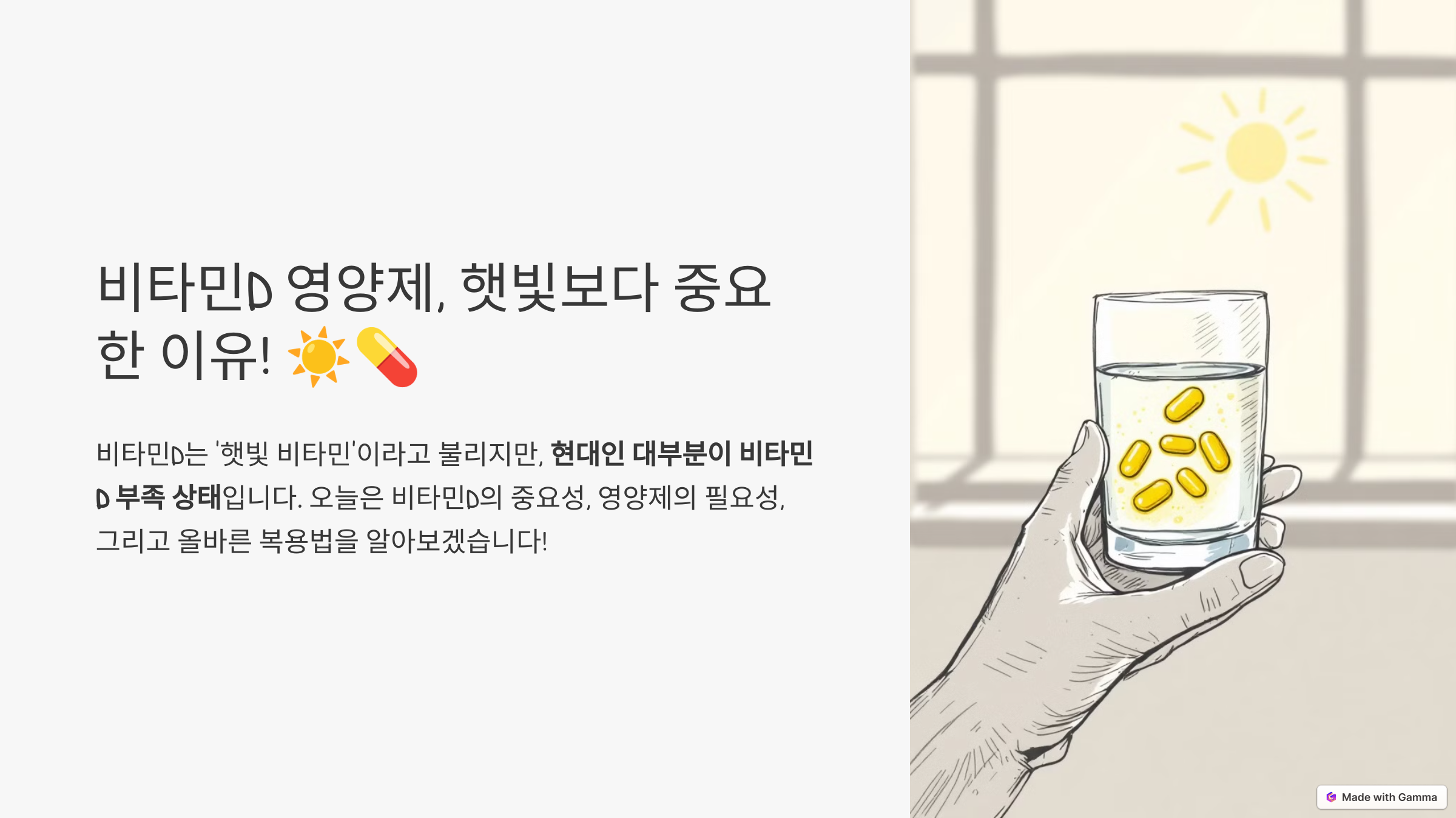 비타민D는 건강을 위해 필수적입니다. 여러분은 평소 챙겨 드시나요? 😊 댓글로 경험을 공유해주세요! 💪